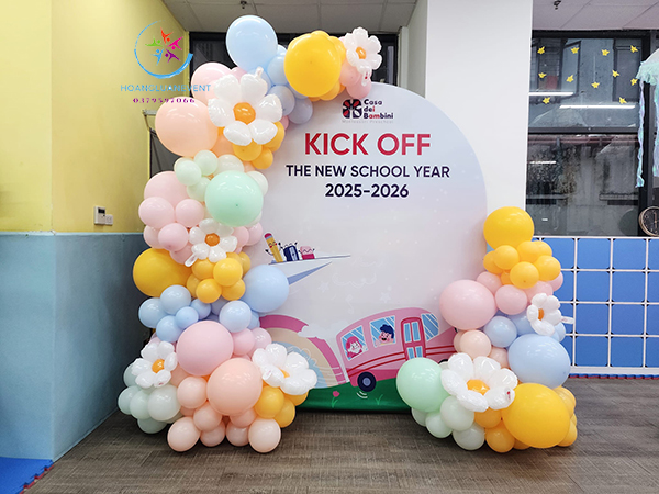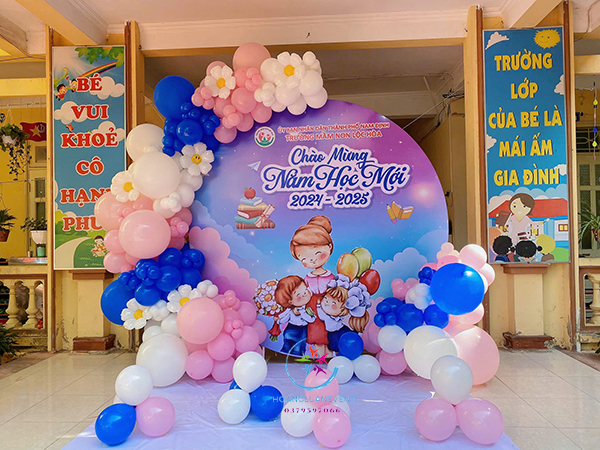 Decor sinh nhật trường học mầm non với backdrop khung bạt hiflex trang trí thêm bóng bay đủ màu sắc rực rỡ tạo nên sự lãng mạn, nó là khởi đầu cho may mắn và hạnh phúc, hướng về tương lai tươi sáng và cuộc sống muôn màu muôn vẻ cho các bé tại trường mầm non.