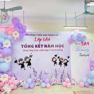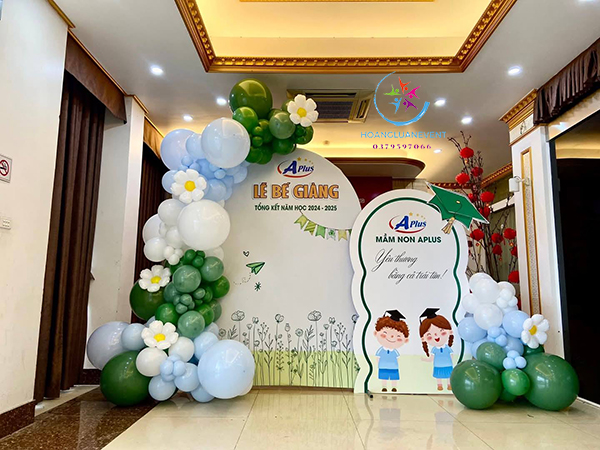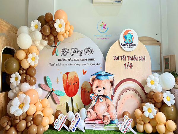 Trang trí bong bóng lễ tổng kết năm học sử dụng nhiều loại bong bóng khác nhau như bong bóng cao su size nhỏ, size lớn, bong bóng hoa mai, bóng hình chuột Mickey…tạo ra không gian đầy màu sắc và hài hòa. Để làm được điều này, bạn có thể lựa chọn những màu sắc phù hợp với không gian của sự kiện.